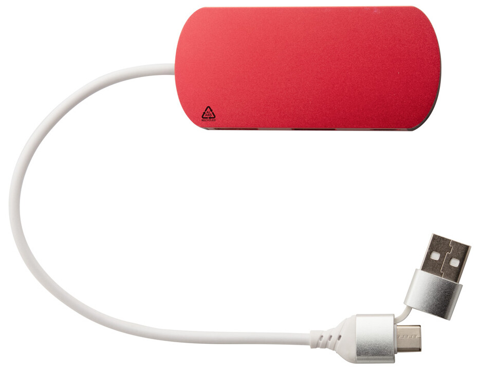USB hub z recyklovaného hliníku a recyklovaného ABS se 2 USB a 1 USB-C portem, USB 2.0. Včetně kabelu s připojením USB a USB-C.