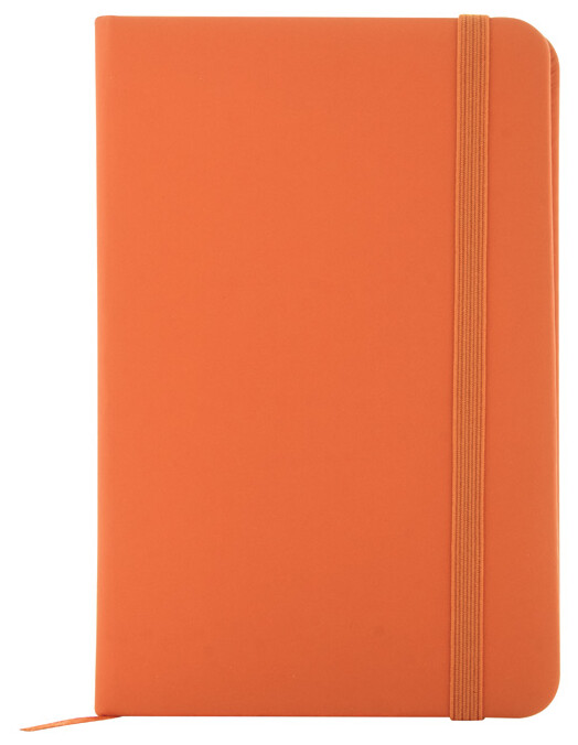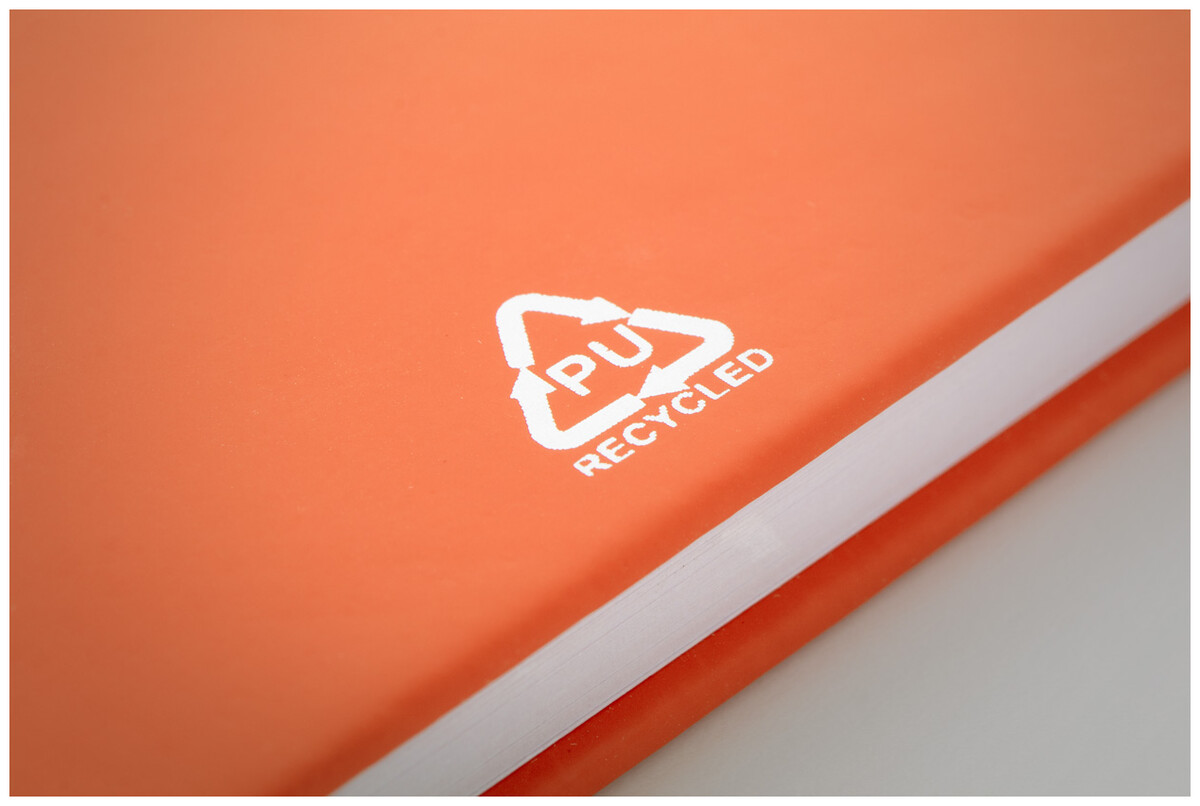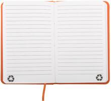 Blok potažený recyklovanou PU kůží se 100 linkovanými listy z recyklovaného papíru. Se záložkou v odpovídající barvě a gumičkou. Velikost A6.