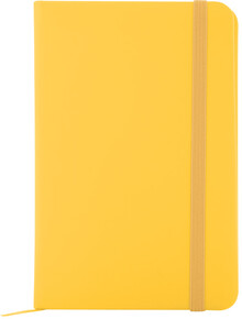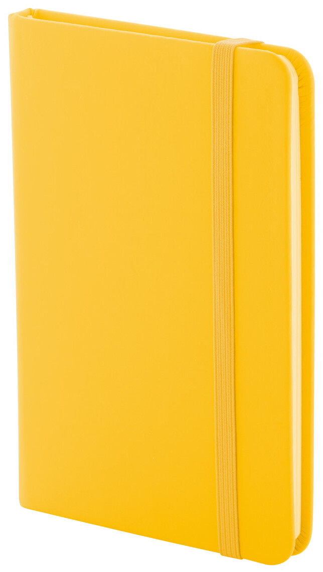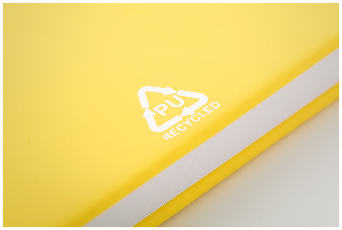 Blok potažený recyklovanou PU kůží se 100 linkovanými listy z recyklovaného papíru. Se záložkou v odpovídající barvě a gumičkou. Velikost A6.