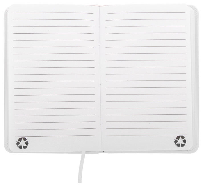 Blok potažený recyklovanou PU kůží se 100 linkovanými listy z recyklovaného papíru. Se záložkou v odpovídající barvě a gumičkou. Velikost A6.