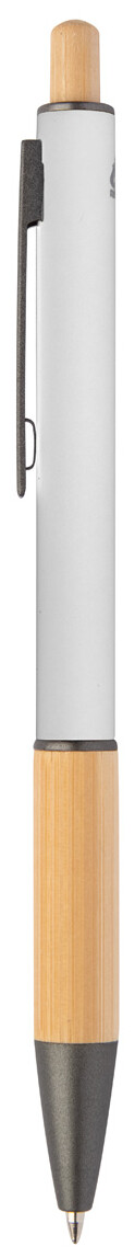 Kuličkové pero z recyklovaného hliníku s bambusovým úchopem a tlačítkem, pogumovaným tělem a kovovými částmi. S modrou náplní.