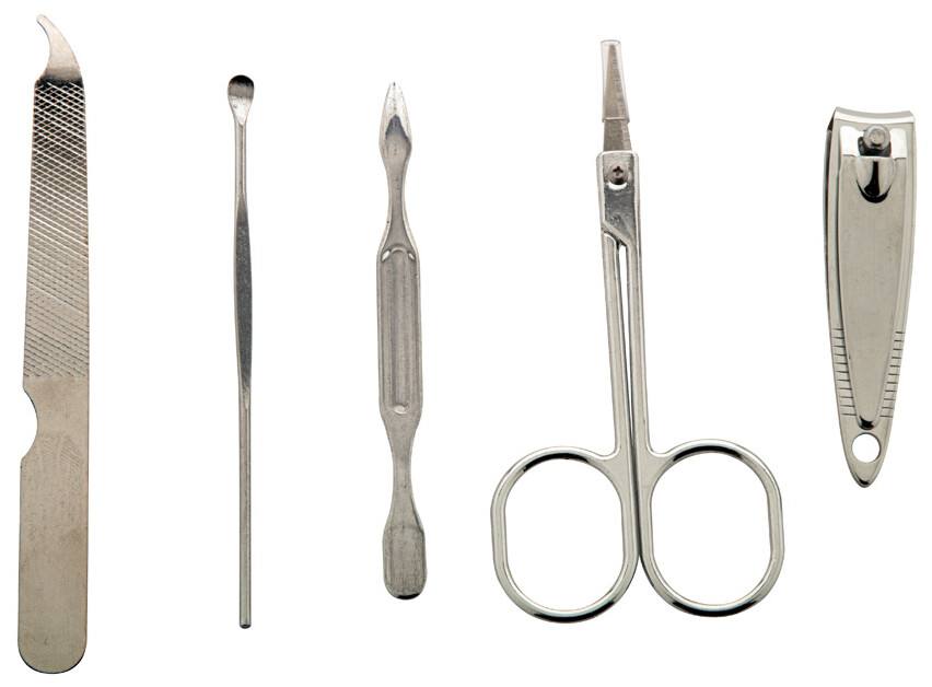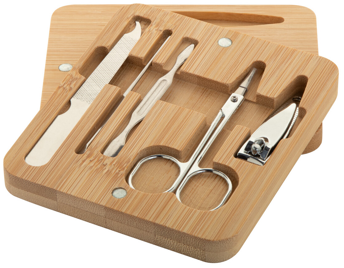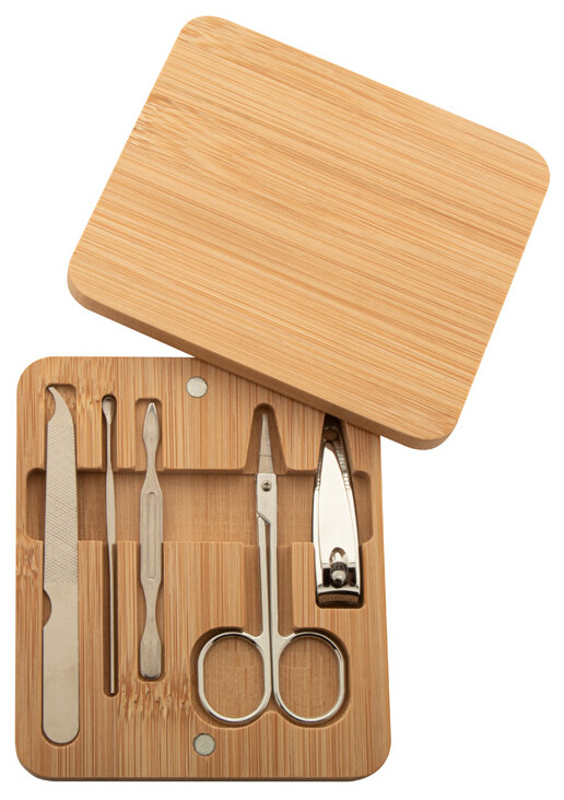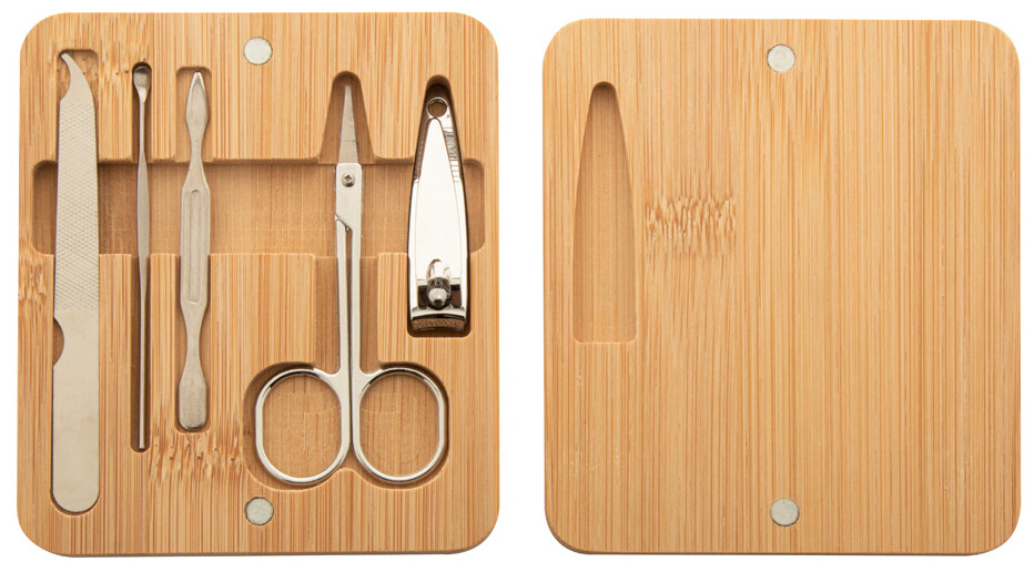 5dílná sada na manikúru z nerezové oceli v bambusové krabičce s magnetickým víkem. Obsahuje kleštičky, nůžky na nehty, pilník na nehty a 2 odstraňovače kůžičky.