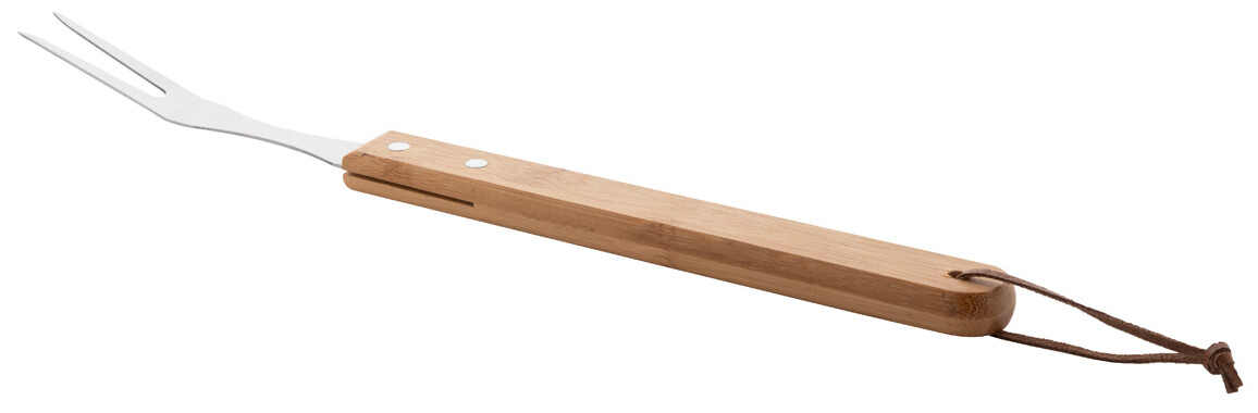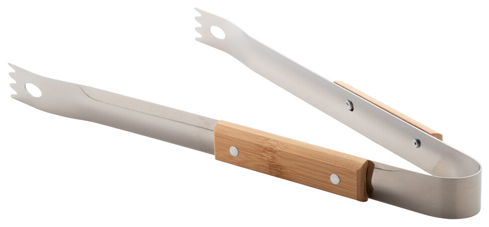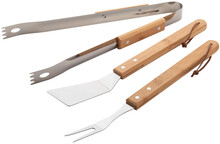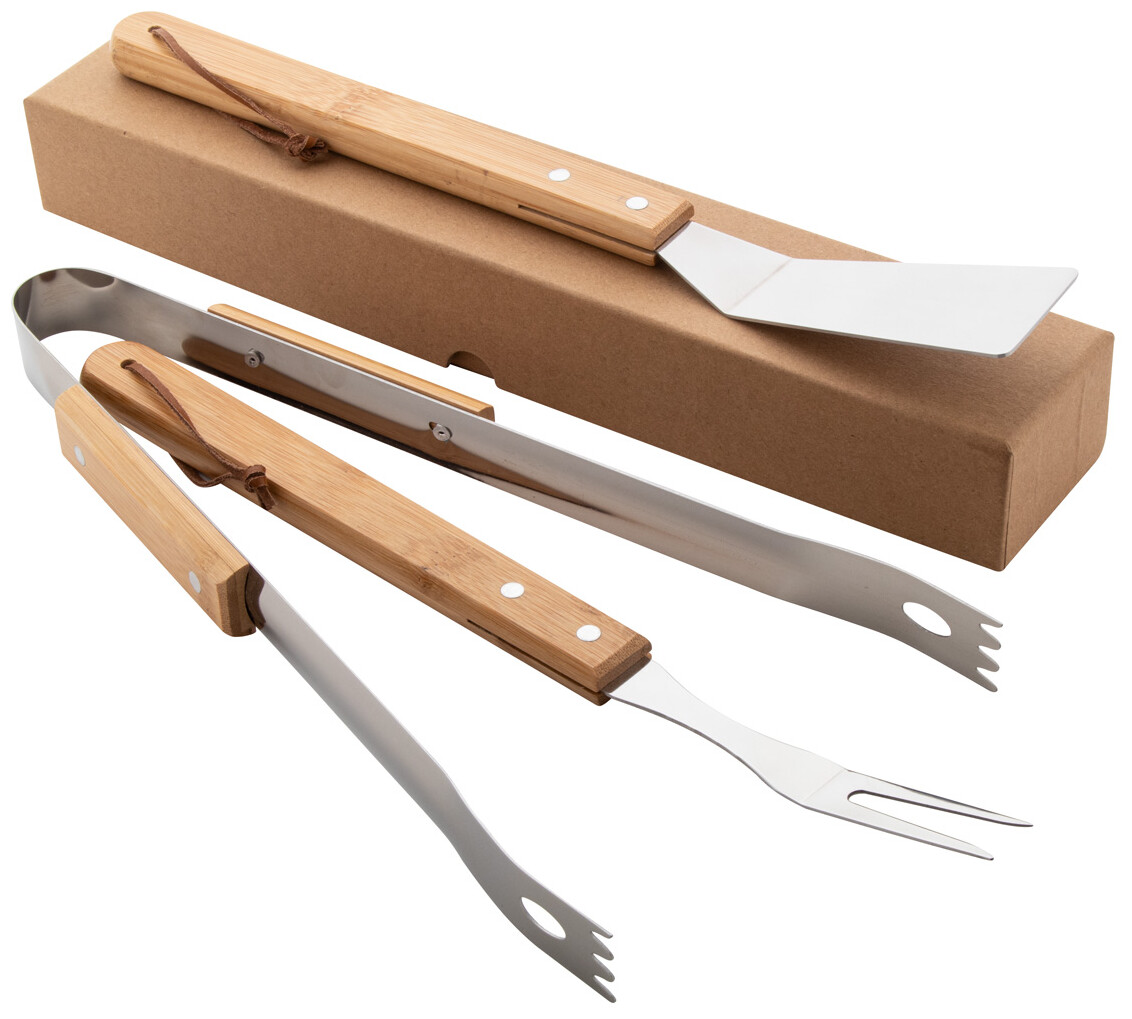 3dílná grilovací sada z nerezové oceli s bambusovou rukojetí (vidlička, kleště a lopatka) v kraftové papírové krabičce.