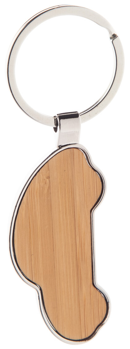 Kovový přívěsek na klíče ve tvaru auta s bambusovou vložkou. V kraftové papírové krabici.