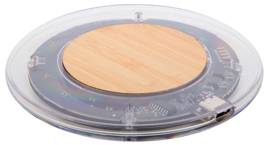 Bezdrátová rychlonabíječka (15W) v průhledném plastovém a bambusovém pouzdře s viditelnými elektronickými součástkami. Včetně USB nabíjecího kabelu.