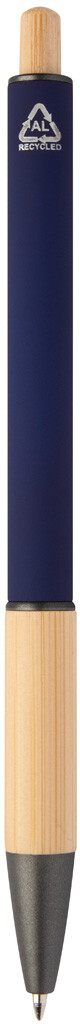 Kuličkové pero z recyklovaného hliníku s bambusovým úchopem a tlačítkem, pogumovaným tělem a kovovými částmi. S modrou náplní.