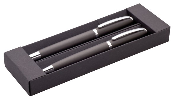 Dárková sada s šedou propiskou a rollerem v černé papírové krabičce.