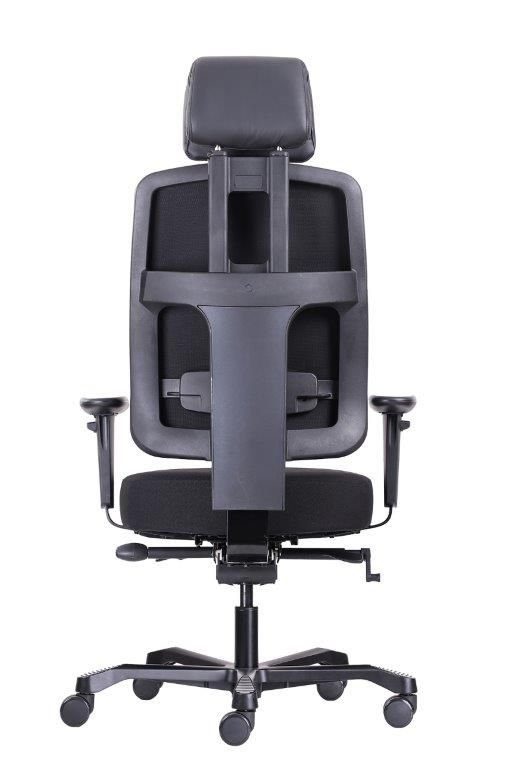 Křeslo speciálně konstruované pro vysoké a těžké postavy s aplikací 24/7 – intenzivní použití, extra vysoký síťovaný opěrák potažený látkou a opěrka hlavy čalouněná hovězí usní pro snadnou údržbu.
