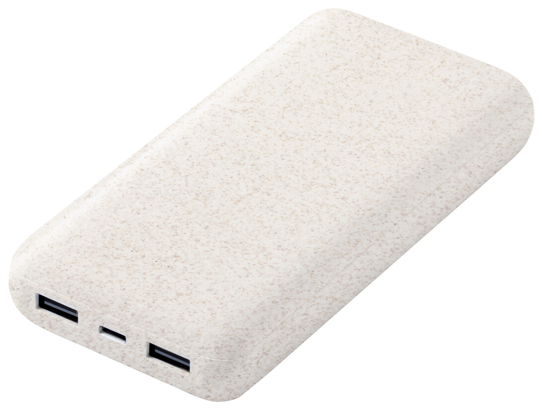 Ekologická plastová powerbanka z pšeničné slámy s 20000 mAh baterií. Se 2 porty USB a 1 portem USB-C pro nabíječku. Vstupní port USB-C.