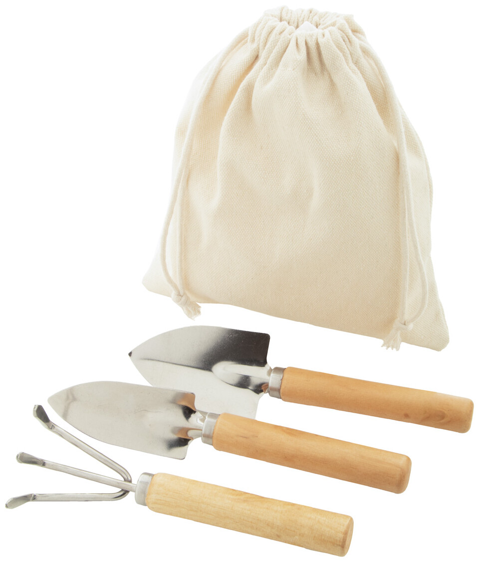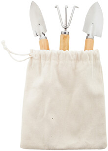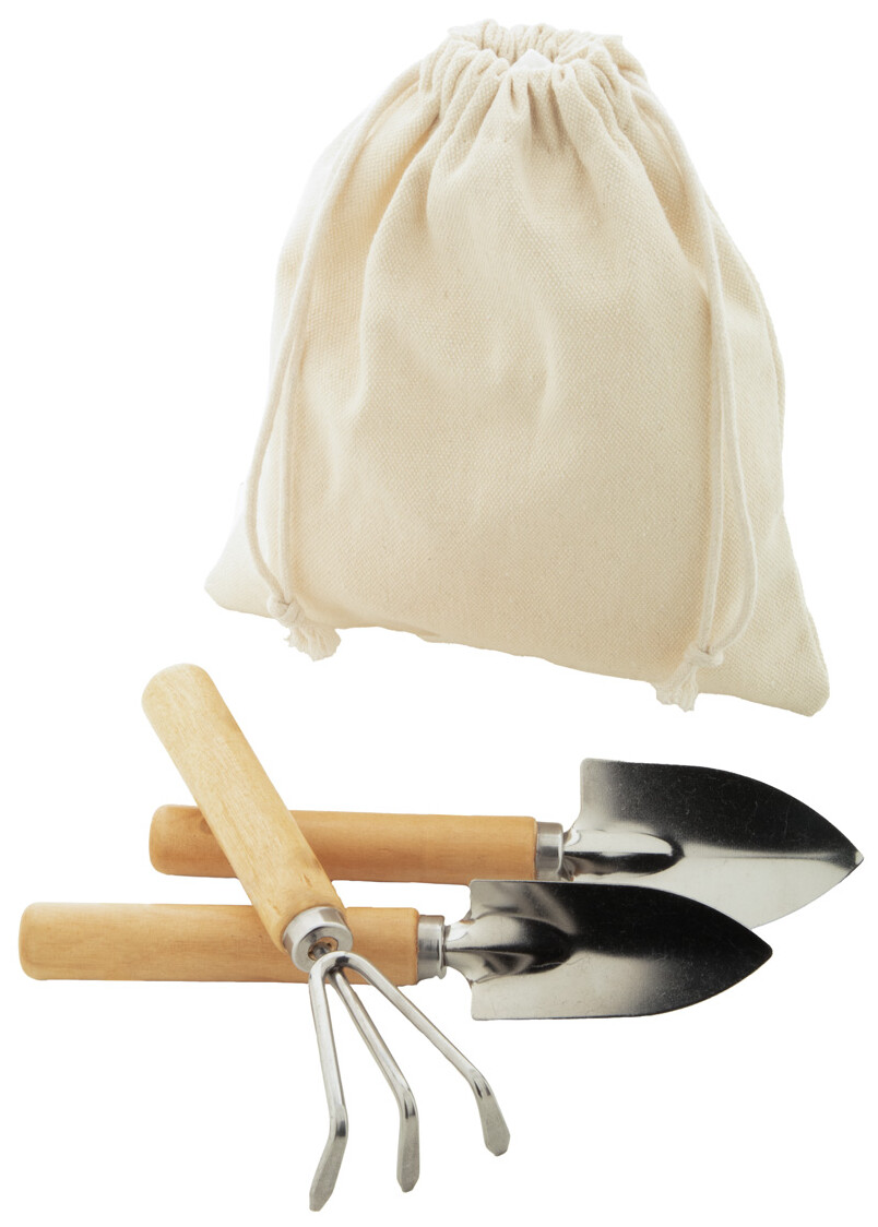 3dílná sada zahradního nářadí z nerezové oceli s dřevěnými rukojeťmi v bavlněném pytlíku se stahovací šňůrkou. Včetně hrabítek a 2 lopatek.