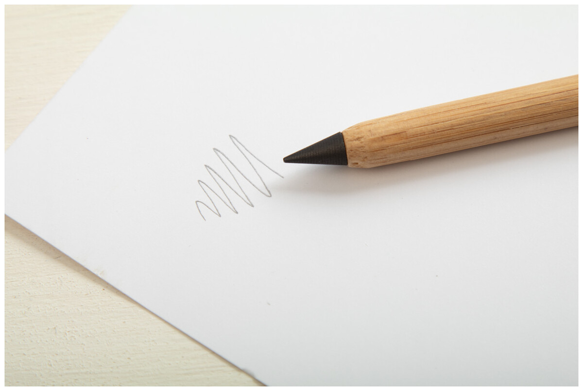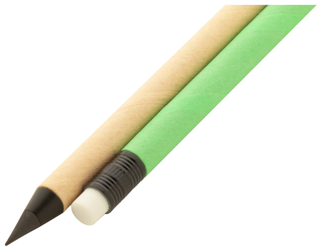 Bez inkoustové pero s dlouhou životností z recyklovaného papíru s černými detaily a gumou. S hrotem z kovové slitiny, který oxiduje papír. Toto pero píše podobně jako tužka a navíc je stíratelné.
