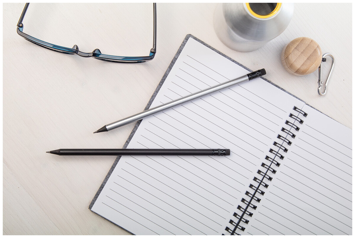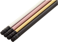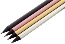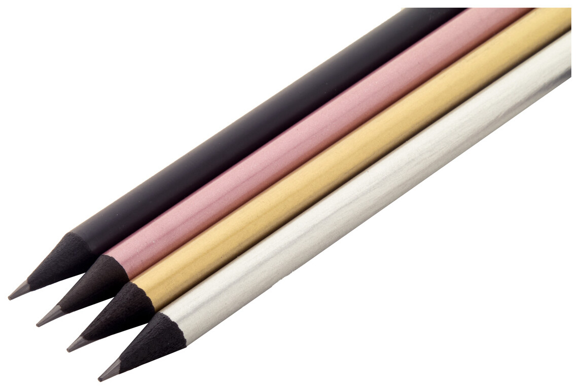 Černá dřevěná tužka v metalickém provedení, s černou gumou. Ořezaná, třída HB.