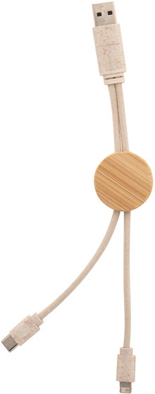 Ekologický USB nabíjecí kabel z pšeničné slámy, bavlny a bambusu s konektory micro USB, USB-C a Lightning. Se vstupy USB a USB-C.