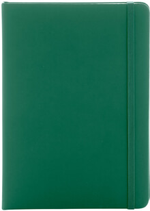 Blok A5 z recyklované PU kůže se 100 čistými listy z recyklovaného papíru. Se záložkou v odpovídající barvě a gumičkou.