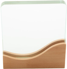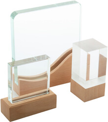 Skleněná trofej s podnoží z bukového dřeva. V kraftové dárkové krabičce.