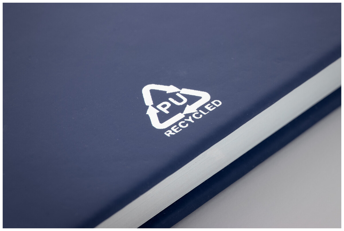 Blok A6 z recyklované PU kůže se 100 čistými listy z recyklovaného papíru. Se záložkou v odpovídající barvě a gumičkou.