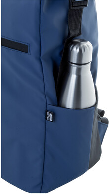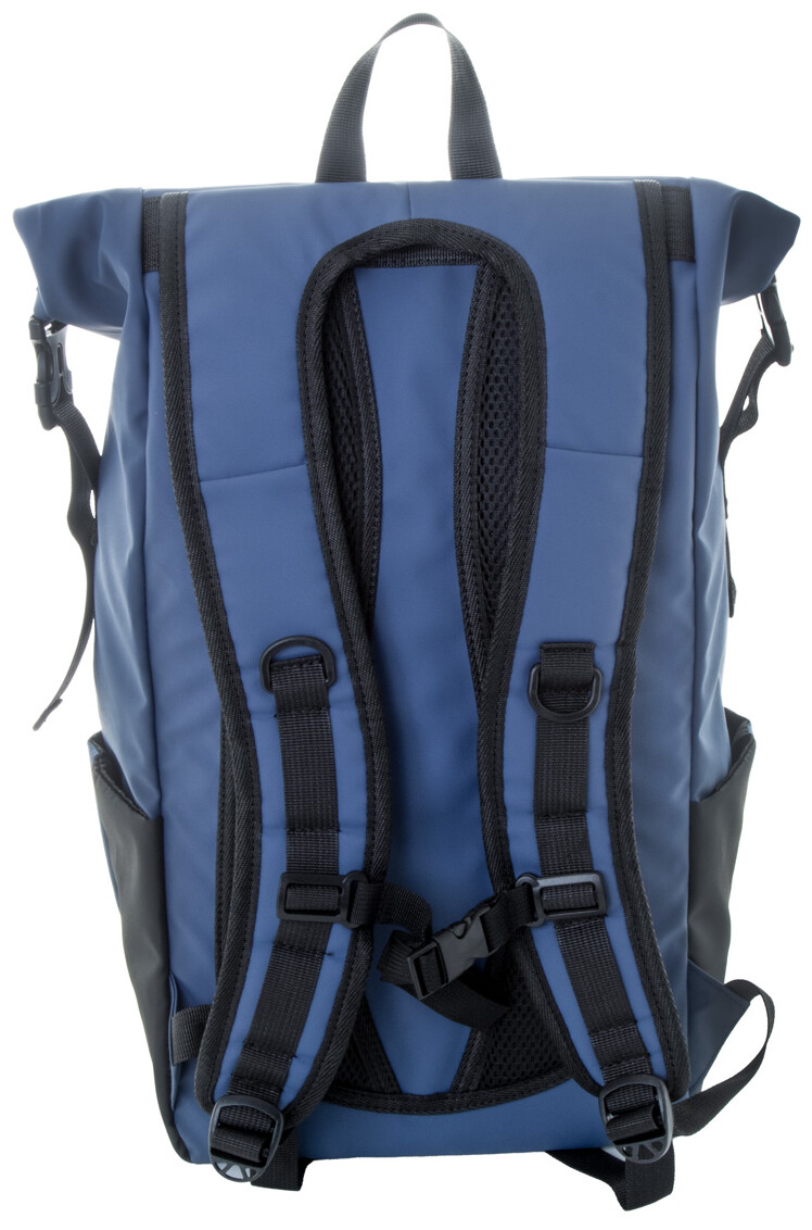Vodotěsný rolovací batoh z RPET se zapínáním na přezku a suchý zip, polstrovaná přihrádka na notebook (16") a tablet (10"), přední kapsa na zip, boční kapsy, polstrovaná záda a ramenní popruhy. Polyester 600D RPET potažený PU, s výrazným štítkem RPET.
