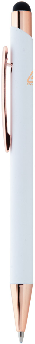 Kuličkové a dotykové pero z recyklovaného hliníku s pogumovaným povrchem a detaily v barvě růžového zlata. Se speciální povrchovou úpravou pro zrcadlové laserové gravírování v barvě růžového zlata. S modrou náplní.