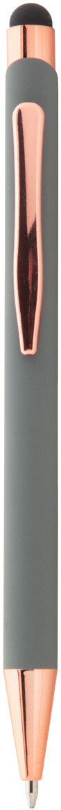 Kuličkové a dotykové pero z recyklovaného hliníku s pogumovaným povrchem a detaily v barvě růžového zlata. Se speciální povrchovou úpravou pro zrcadlové laserové gravírování v barvě růžového zlata. S modrou náplní.