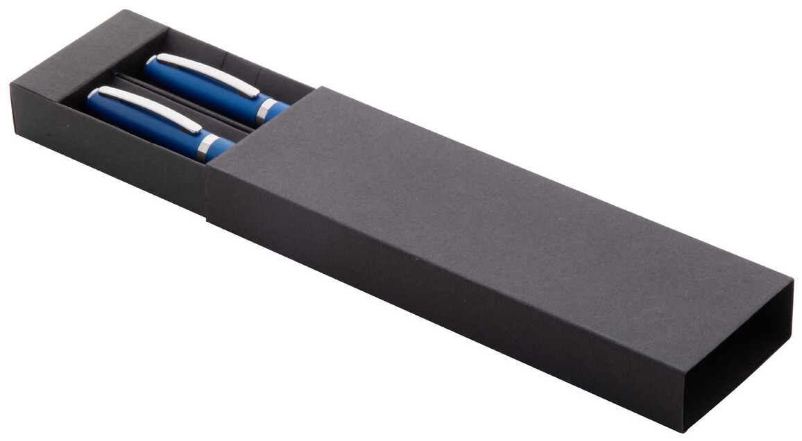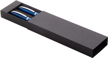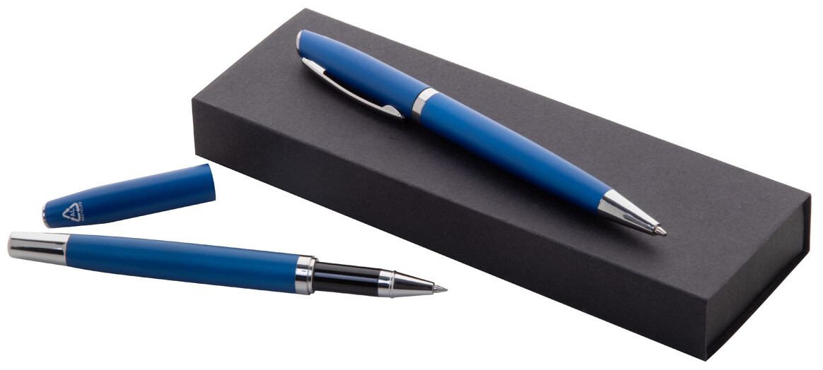 Sada per z recyklovaného hliníku s rollerem a kuličkovým perem v černé papírové dárkové krabičce. S modrou náplní.