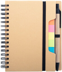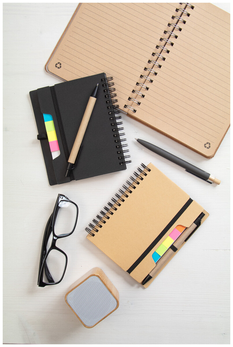 Spirálový blok A6 z recyklovaného papíru se 70 linkovanými listy a 125 popisovači stránek (v 5 různých barvách). S gumovým páskem a držákem na pero. Včetně kuličkového pera z recyklovaného papíru s modrou náplní.