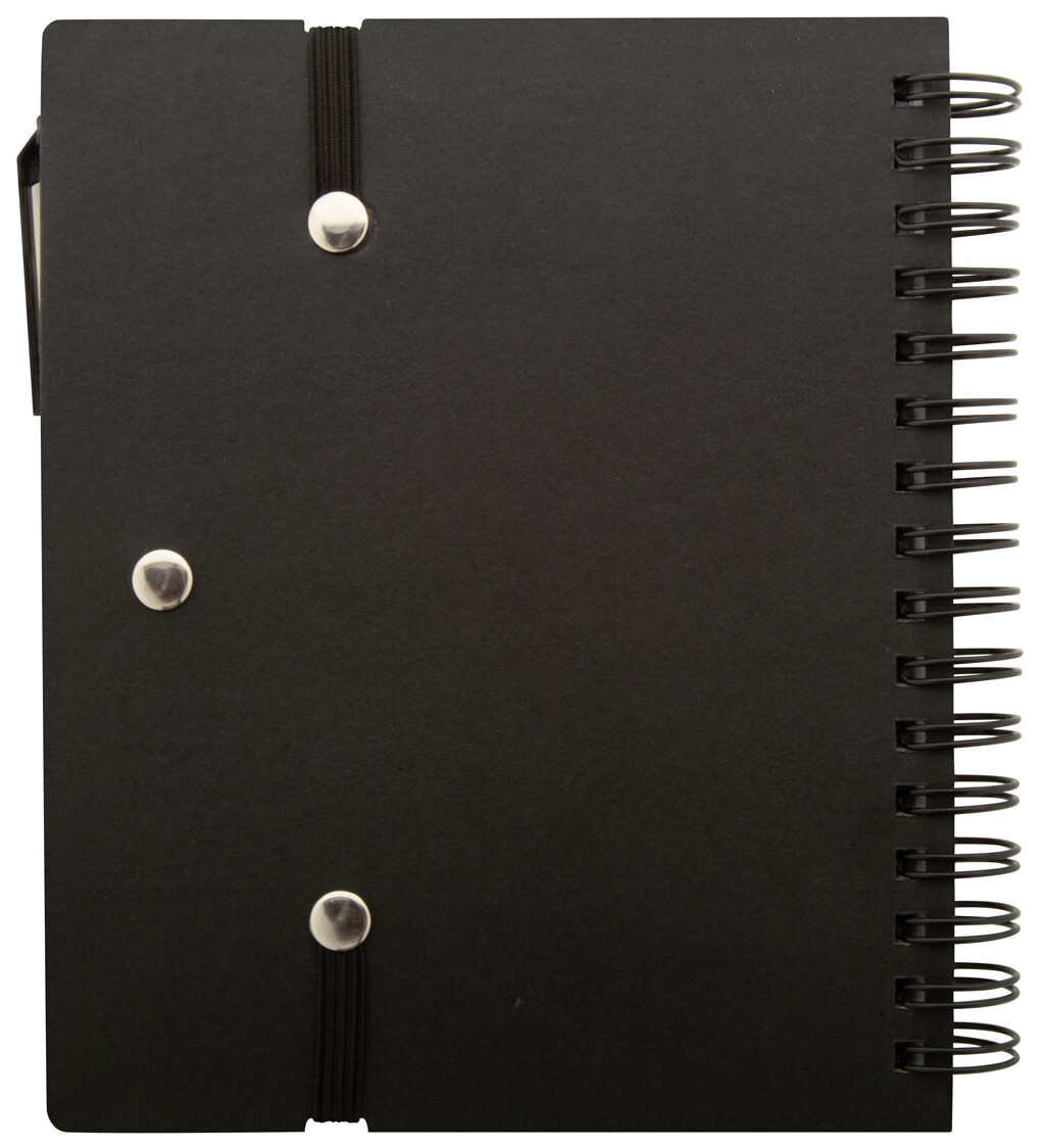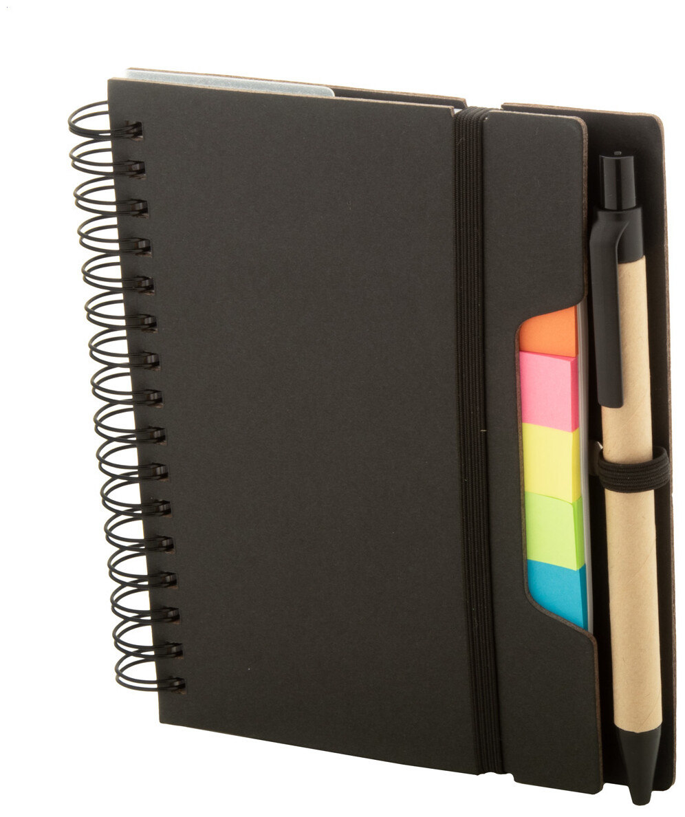 Spirálový blok A6 z recyklovaného papíru se 70 linkovanými listy a 125 popisovači stránek (v 5 různých barvách). S gumovým páskem a držákem na pero. Včetně kuličkového pera z recyklovaného papíru s modrou náplní.