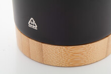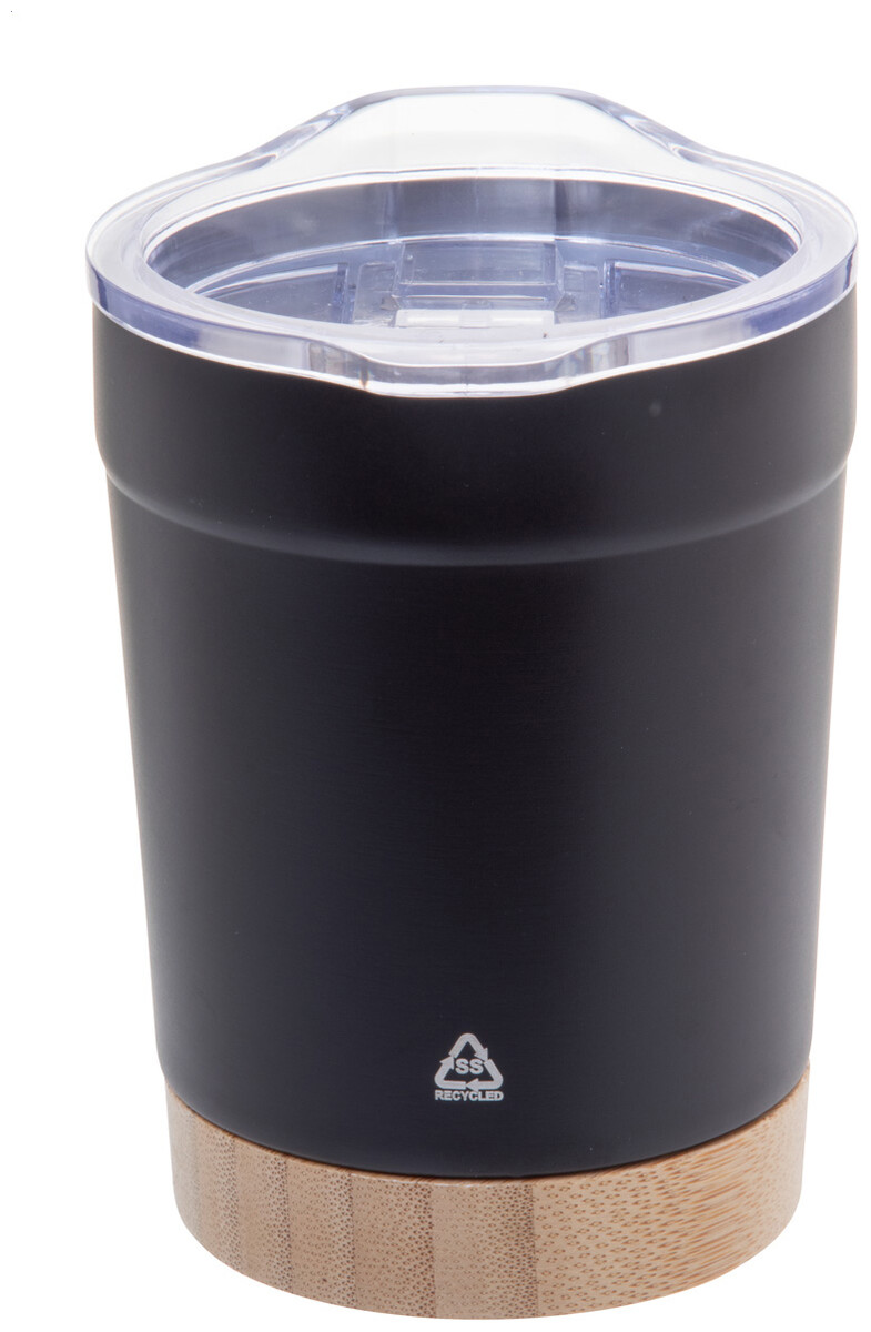 Dvoustěnný vakuově izolovaný termo hrnek z recyklované nerezové oceli s bambusovým dnem a AS plastovým víčkem na pití. 300 ml.