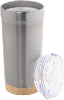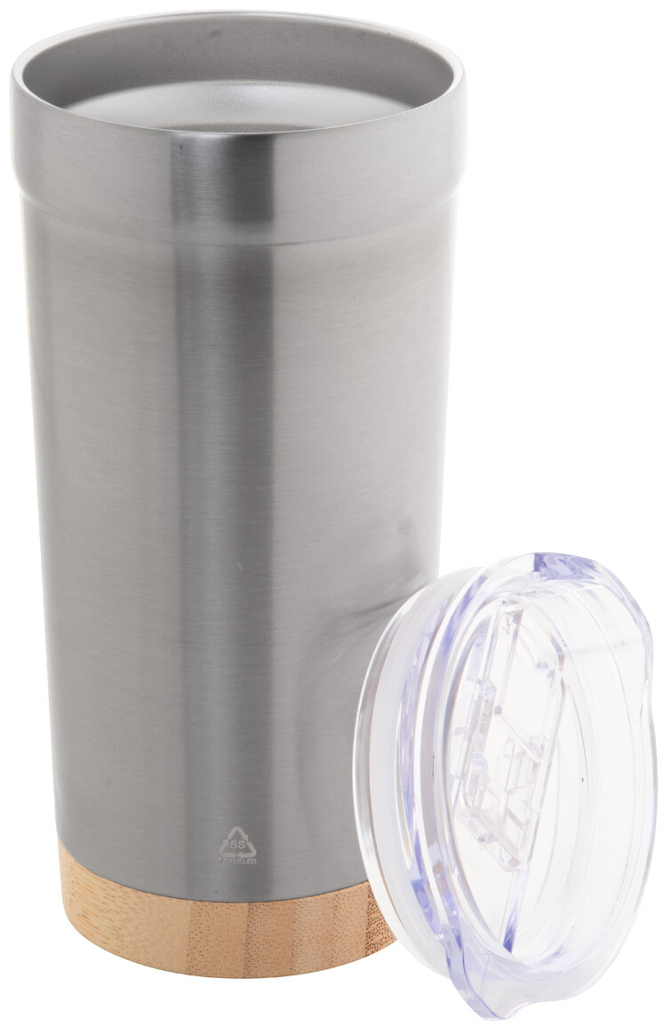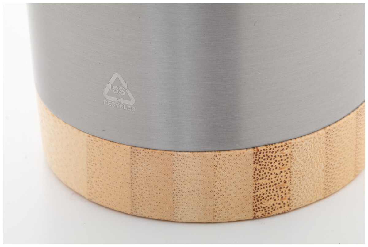 Dvoustěnný vakuově izolovaný termo hrnek z recyklované nerezové oceli s bambusovým dnem a AS plastovým víčkem na pití. 600 ml.