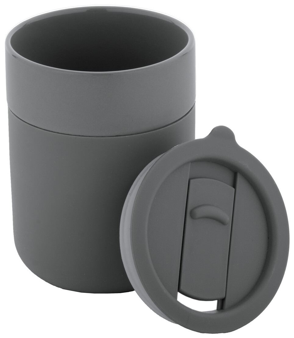 Silikonem potažený keramický cestovní kelímek s PP plastovým odkapávacím víčkem. 300 ml.