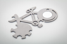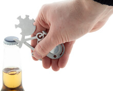 Multifunkční nářadí ve tvaru kola z nerezové oceli s 11 funkcemi.