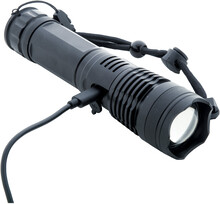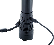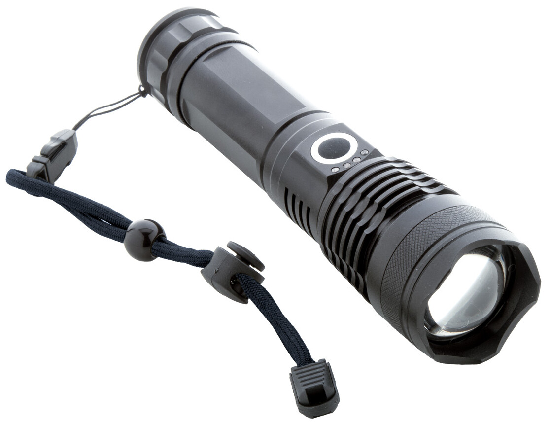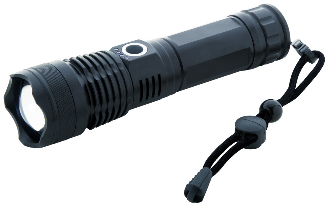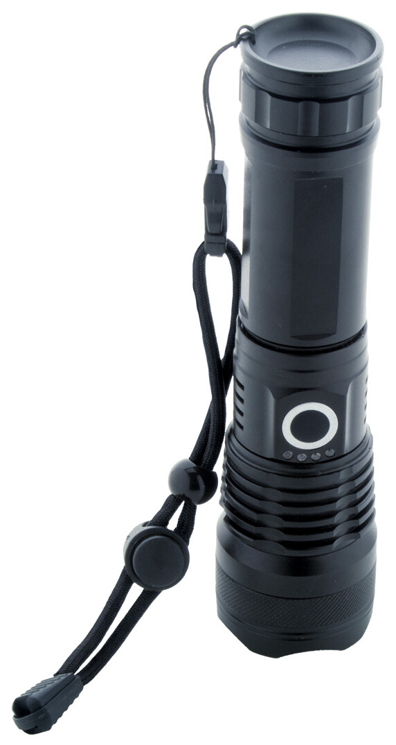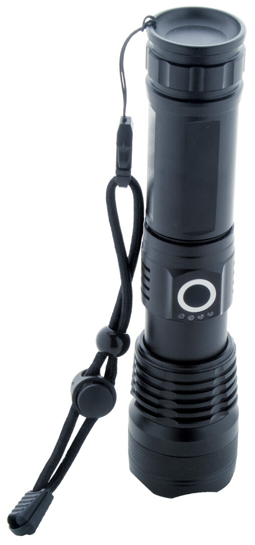 Hliníková baterka s vestavěnou USB dobíjecí baterií (1500 mAh) a popruhem na přenášení. Se zoomovatelným vysoce výkonným COB světlem. S vysokým, středním, nízkým a blikajícím světlem. Včetně USB nabíjecího kabelu.
