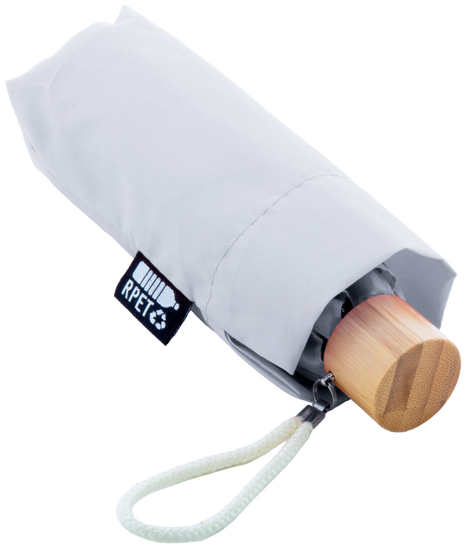 Manuální, větruodolný 3-skládací mini deštník s 6 panely v pouzdru v odpovídající barvě. S kovovým rámem, sklolaminátovými žebry, bambusovou rukojetí a bavlněným poutkem na ruku. 190T RPET pongee, s výrazným štítkem RPET.