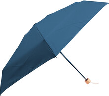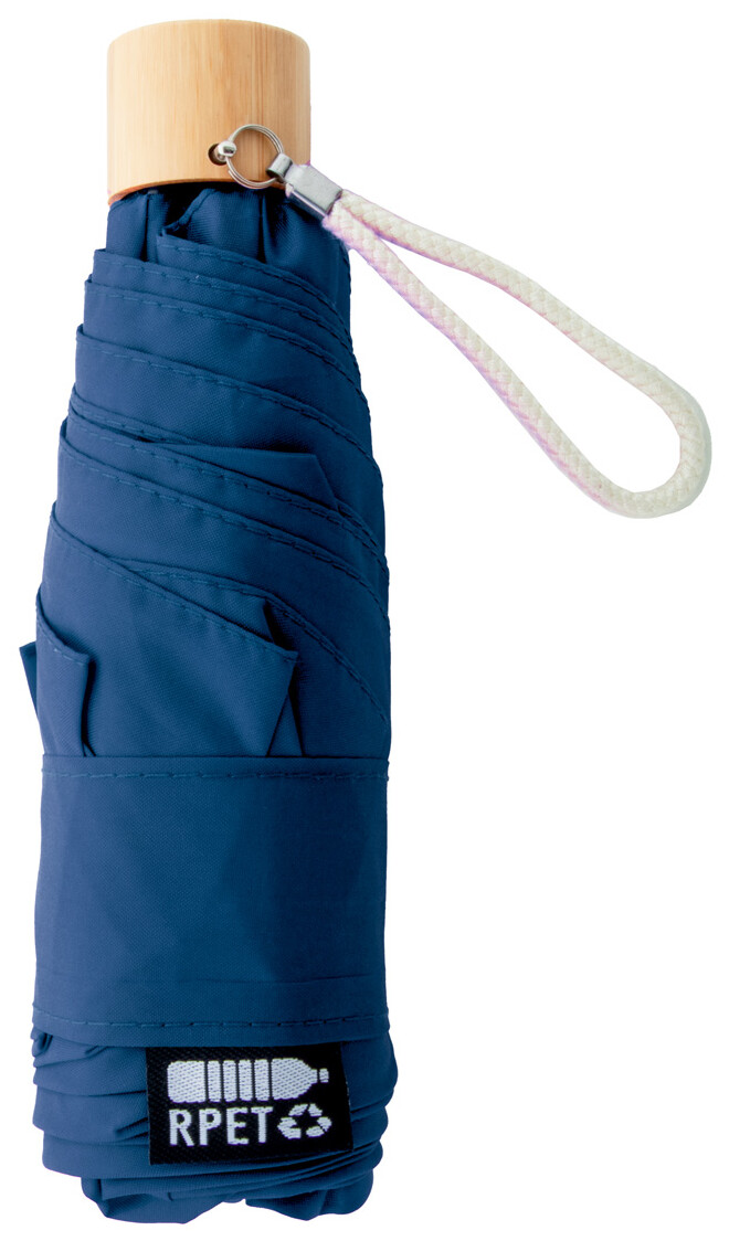 Manuální, větruodolný 3-skládací mini deštník s 6 panely v pouzdru v odpovídající barvě. S kovovým rámem, sklolaminátovými žebry, bambusovou rukojetí a bavlněným poutkem na ruku. 190T RPET pongee, s výrazným štítkem RPET.