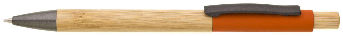 Bambusová propiska s oranžovou hliníkovou částí pod klipem, ideálním pro značení laserem. Náplň X20 modře píšící. Kolekce SAVE THE NATURE.