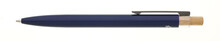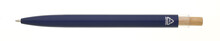 Modrá designová kovová propiska z recyklovaného hliníku. Tmavý kovový klip je uchycen v ozdobné transparentní koncovce, doplněné bambusovým cvakátkem. Náplň velkoobsahová, modře píšící. Kolekce SAVE THE NATURE.