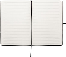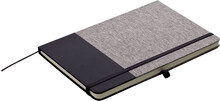 Zápisník DIRAO A5 v deskách v kombinaci šedého RPET a černé PU kůže má 80 linkovaných listů. Blok má uzavírací gumičku, poutko na propisku a textilní záložku v černé barvě.