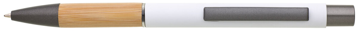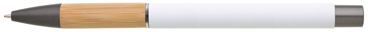 Kovová propiska s hnědo-černými doplňky, bílým pogumovaným povrchem a bambusovým úchopem. Náplň VO modře píšící. Kolekce SAVE THE NATURE.