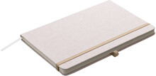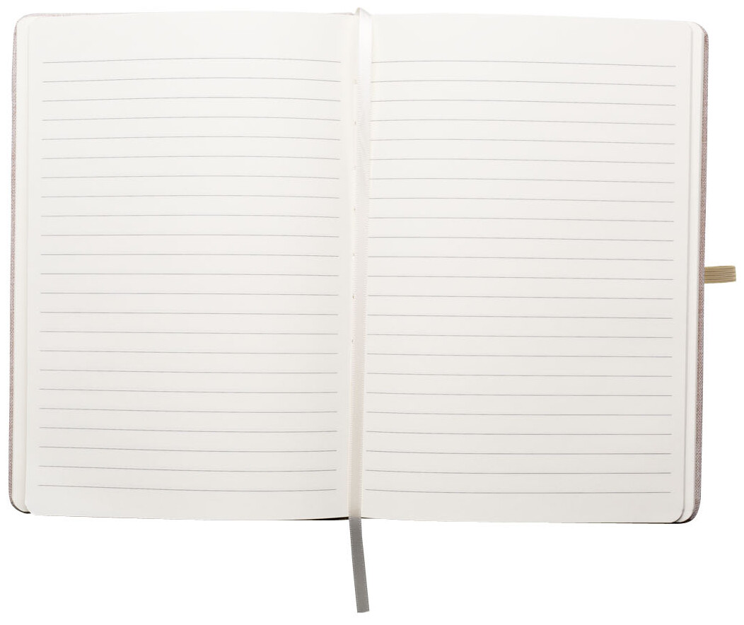 Zápisník A5 v deskách potažených béžovou látkou z recyklované bavlny má 80 linkovaných listů. Blok má uzavírací gumičku, poutko na propisku a textilní záložku v přírodní barvě.