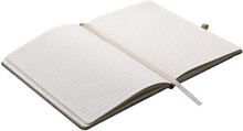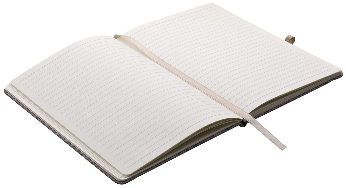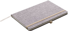 Zápisník A5 v deskách potažených šedou látkou z recyklované bavlny má 80 linkovaných listů. Blok má uzavírací gumičku, poutko na propisku a textilní záložku v přírodní barvě.