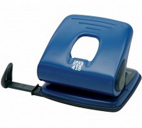 Stolní celokovový děrovač. Děrovač s kapacitou až 25 listů, průměr otvoru 5,5 mm, rozteč otvorů 80 mm. Plastový příložník. Barevné provedení: modré.