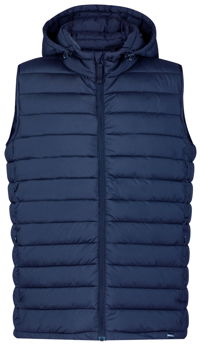 Větru a vodě odolná vesta na zip s bočními kapsami na zip a nastavitelnou kapucí. S polyesterovým pouzdrem RPET. 100% RPET polyester s výrazným štítkem RPET.
