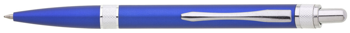 Plastová propiska s metalickým modrým povrchem a chromovými ozdobnými detaily. Velkoobsahová, modře píšící náplň.