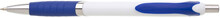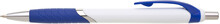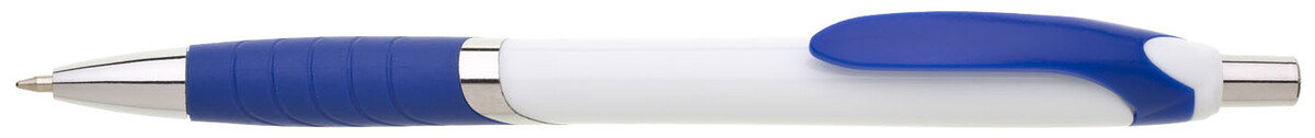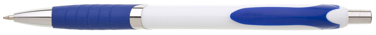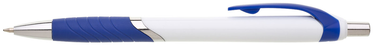 Plastová propiska s bílým tělem s modrým úchopem a klipem a stříbrnými doplňky. Černě píšící.