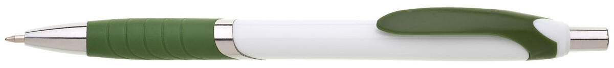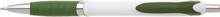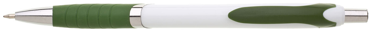 Plastová propiska s bílým tělem se zeleným úchopem a klipem a stříbrnými doplňky. Černě píšící.