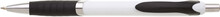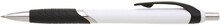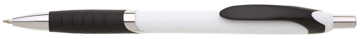 Plastová propiska s bílým tělem s černým úchopem a klipem a stříbrnými doplňky. Černě píšící.