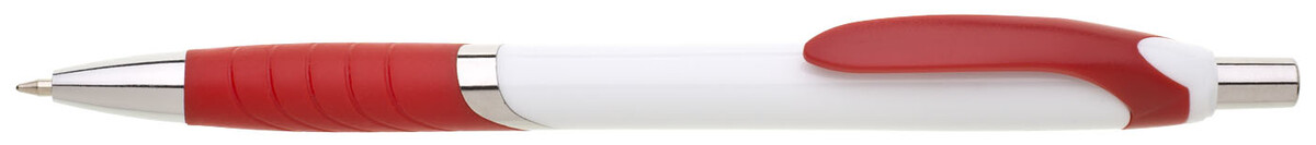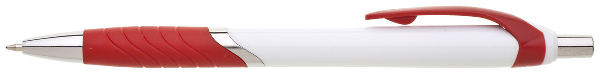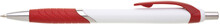 Plastová propiska s bílým tělem s červeným úchopem a klipem a stříbrnými doplňky. Černě píšící.