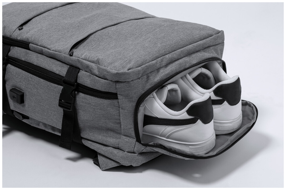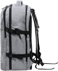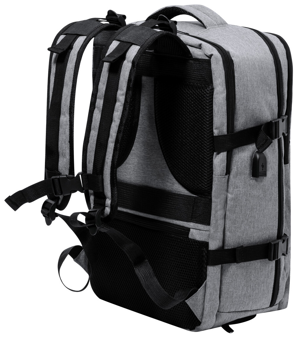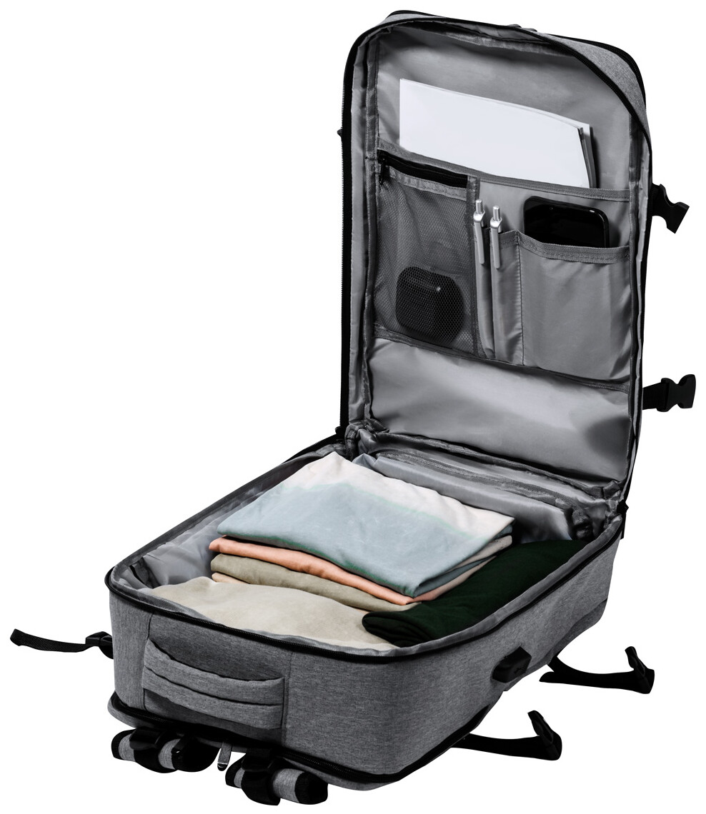 Voděodolný RPET batoh se 3 hlavními přihrádkami na zip, 2 předními kapsami na zip, boční kapsou na zip a skrytou kapsou proti krádeži. S polstrovanými přihrádkami na notebook (17") a botami, polstrovanými zády a ramenními popruhy. S popruhem na vozík a vestavěným USB připojením pro powerbanky. Polyester 300D RPET s výrazným štítkem RPET.