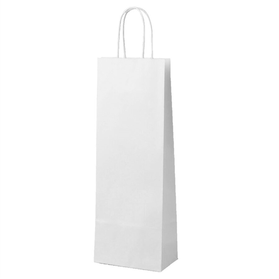 Elegantní bílá papírová taška s pevnými kroucenými uchy, speciálně navržená pro jednu lahev vína. Rozměry 14 x 8 x 39 cm