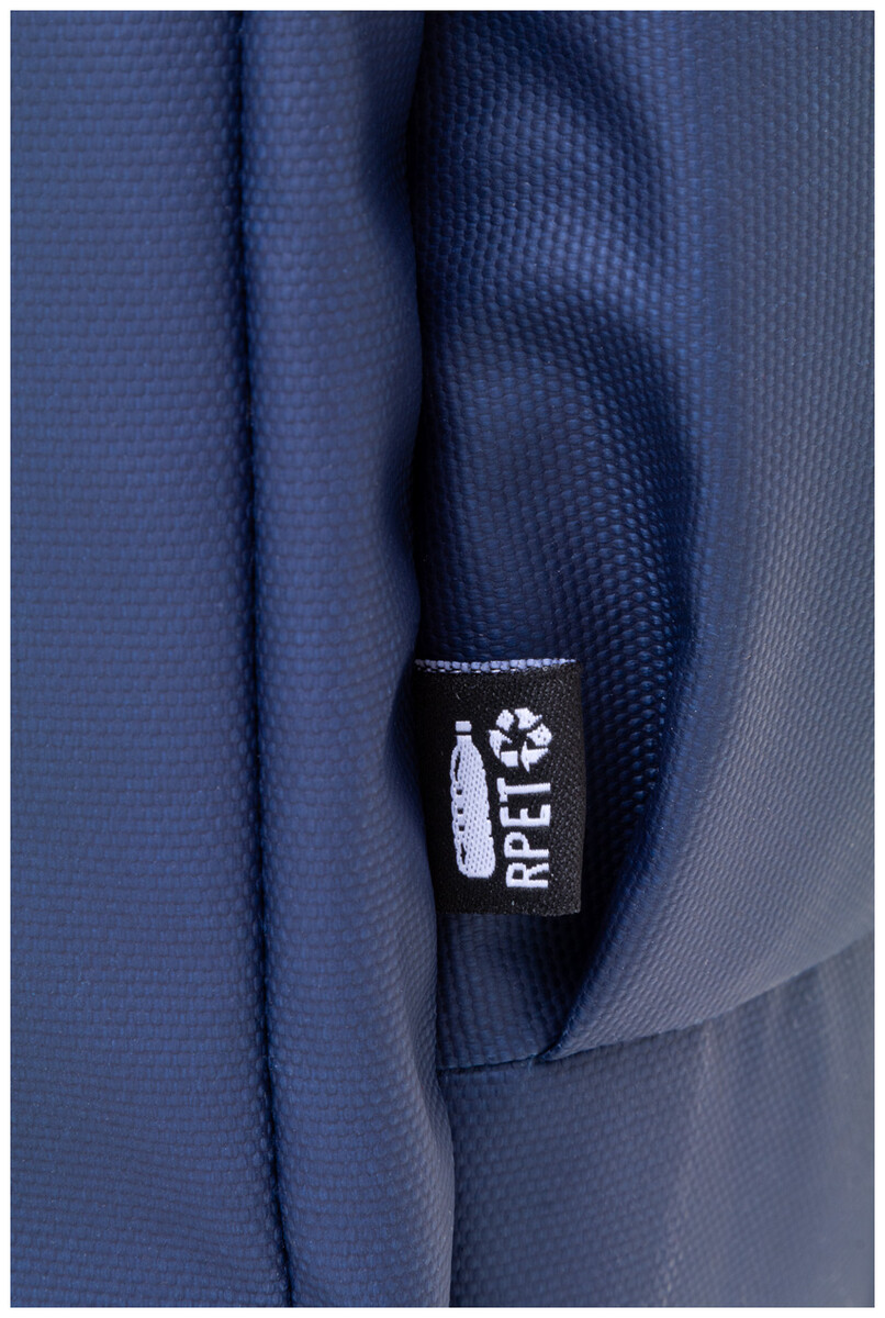 Vodotěsný batoh RPET se 2 přihrádkami na zip, 2 předními kapsami na zip, bočními kapsami a polstrovanou přihrádkou na notebook (16"). S popruhem na vozík, polstrovanými zády a ramenními popruhy. Polyester 600D RPET potažený PU, s výrazným štítkem RPET.
