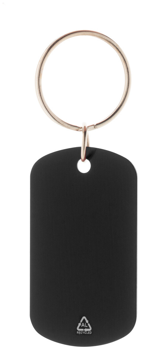 Přívěšek na klíče z recyklovaného hliníku s kovovým kroužkem.